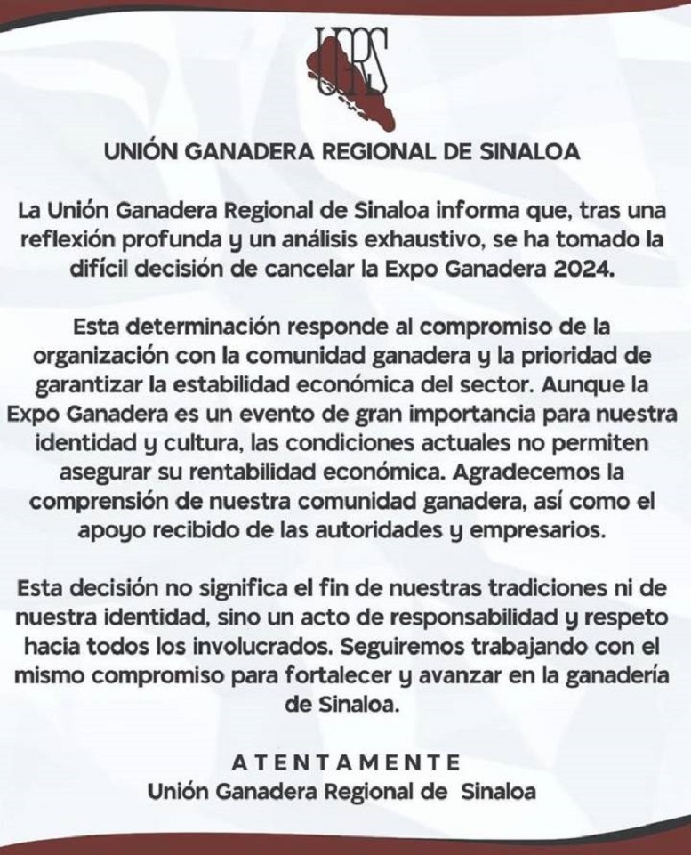 “Esta decisión no significa el fin de nuestras tradiciones e identidad, sino un acto de responsabilidad y respeto hacia todos los involucrados. Seguiremos trabajando con el mismo compromiso para fortalecer y avanzar en la ganadería de Sinaloa”, cierra el boletín de prensa.
