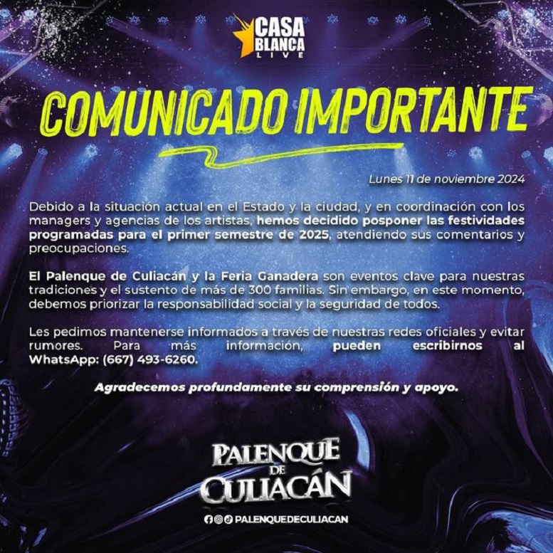 “El Palenque de Culiacán y la Feria Ganadera son eventos clave para nuestras tradiciones y el sustento de más de 300 familias, Sin embargo, en este momento, debemos priorizar la responsabilidad social y la seguridad de todos”, agregaron en el comunicado.